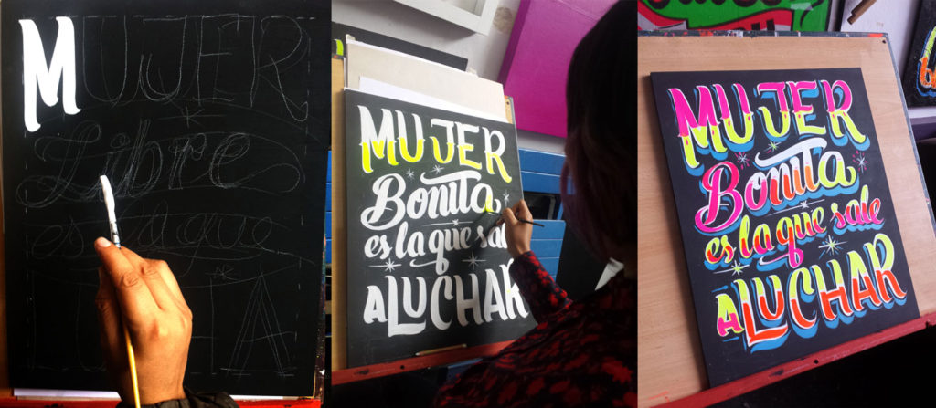 We interviewed Azucena León during the ATypI conference in São Paulo in October 2015, when the Alphabettes blog was barely in its first weeks of life. Azucena and her partner, Alinder Espada, had a stall in the conference market place, where she was composing and selling lettering posters. What immediately caught our attention was the bold, fluorescent and immediate hand lettering, with strong messages distilled from the Peruvian version of Cumbia, the popular music of Colombia. The messages combined references to music, ‘la novela’ (soap opera), but mostly, a sense of pure drama: tu castigo será verme feliz [your punishment will be seeing me happy], el buen amante nunca se enamora [the good lover never falls in love], no se gana pero se goza [you can’t win, but enjoy it anyway], está prohibido estar triste [sadness is not allowed], se sufre pero se aprende [you suffer but you learn] and so on. It was not easy to find a free slot during her busy day, as every ATypI attendee wanted one of her posters.